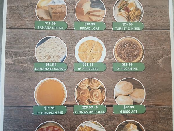 Turkey dinner plates with all the traditional favorite sides, as well as trays, including stuffing, pies, and cheesecakes.